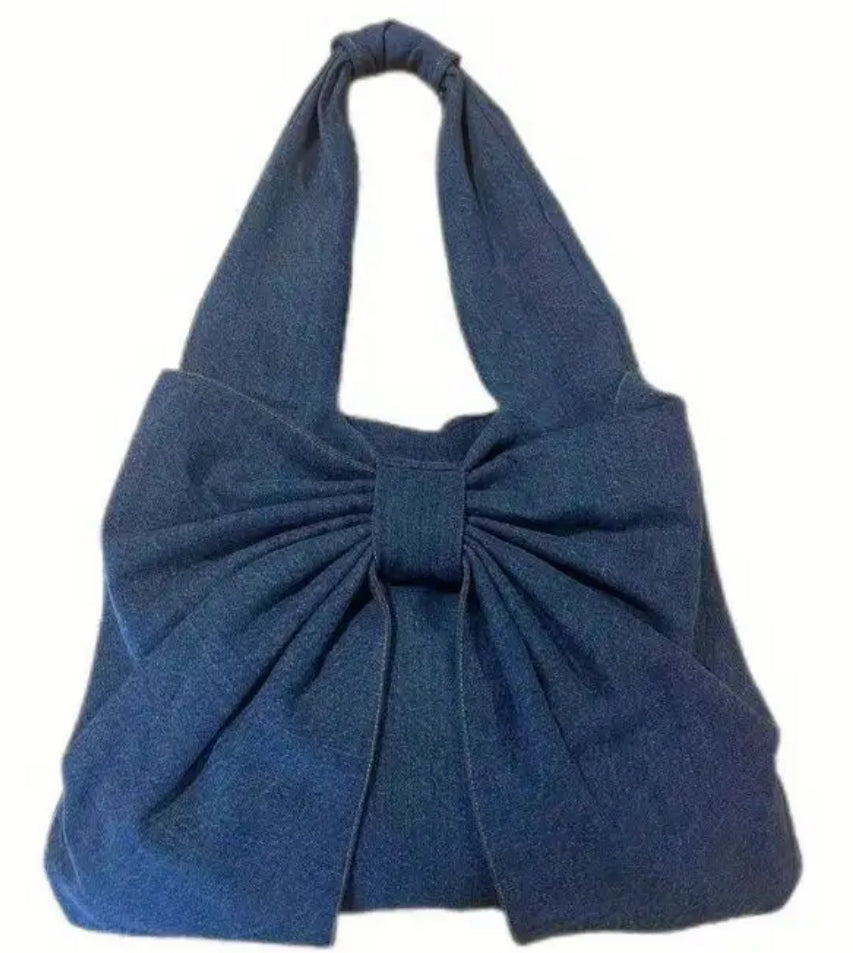 Denim fabric and a delicate bow make this purse both stylish and versatile.