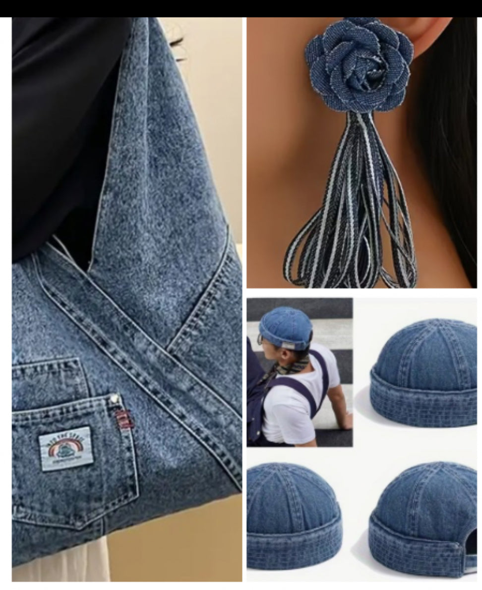 Your new go-to trio: a sleek denim cap, matching purse, and earrings to complete any street , chic , ready look.