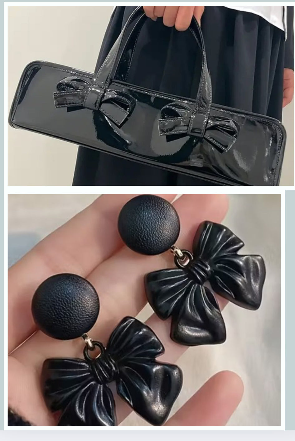 Elevate your look with this chic and feminine set featuring a glossy a vegan patent leather purse adorned with a statement bow accent. The sleek high-shine finish adds a touch of luxury , while the matching earrings complete your outfit with effortless charm. Perfect for brunch dates , special occasions, or everyday glam. This set blends elegance and modern style.